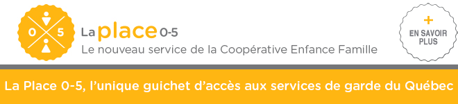 La Place 0-5 est l'unique guichet d'accès aux services de garde du Québec. Inscrivez-vous ou mettez à jour votre dossier au www.laplace0-5.com. Pour les parents sans accès à Internet, vous pouvez appeler au 514 270-5055 (ou au 1 844 270-5055).